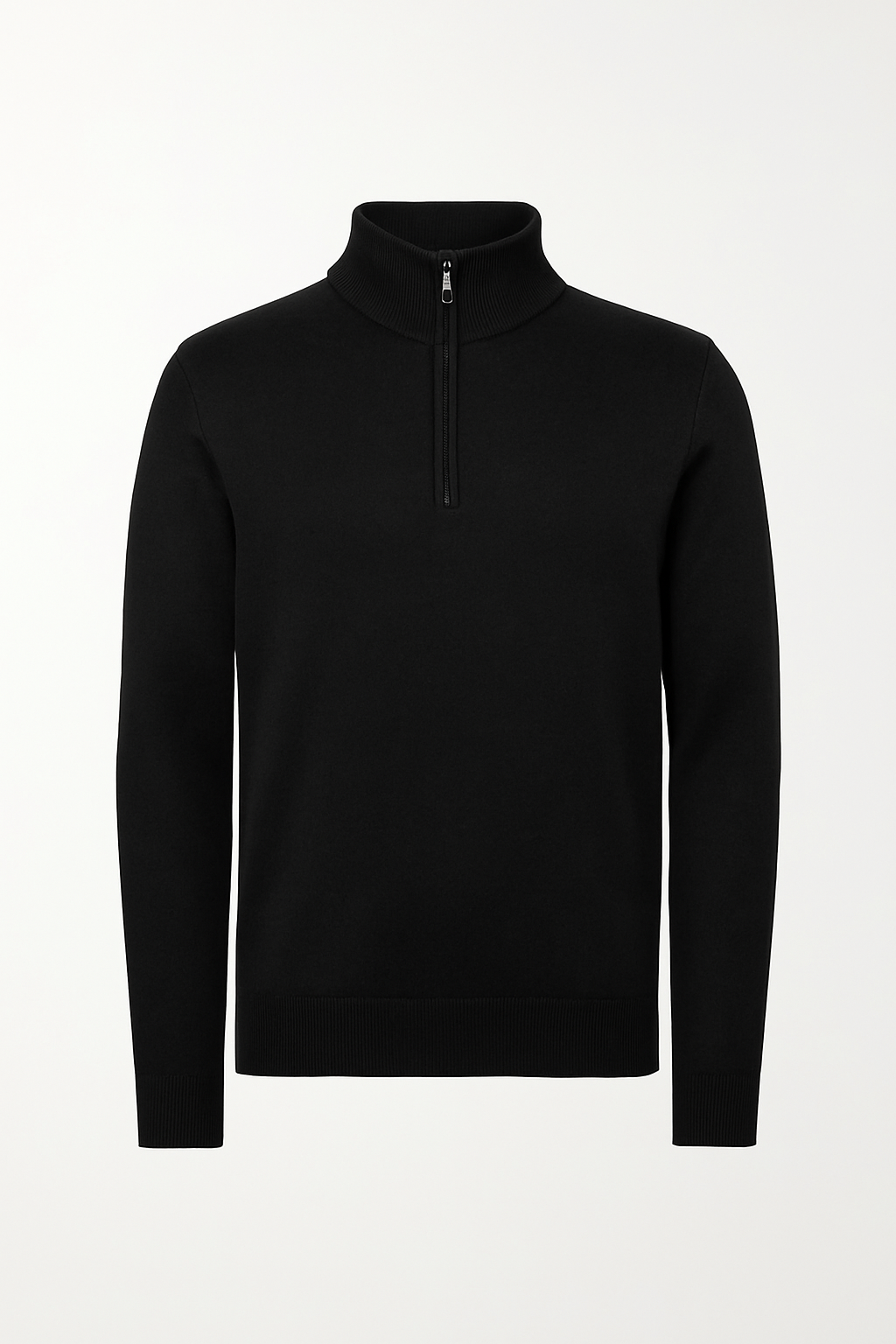 De moderne half zip-sluiting met metalen rits en de subtiele ribstructuur maken de trui veelzijdig — draag hem stijlvol over een overhemd of casual op de huid.