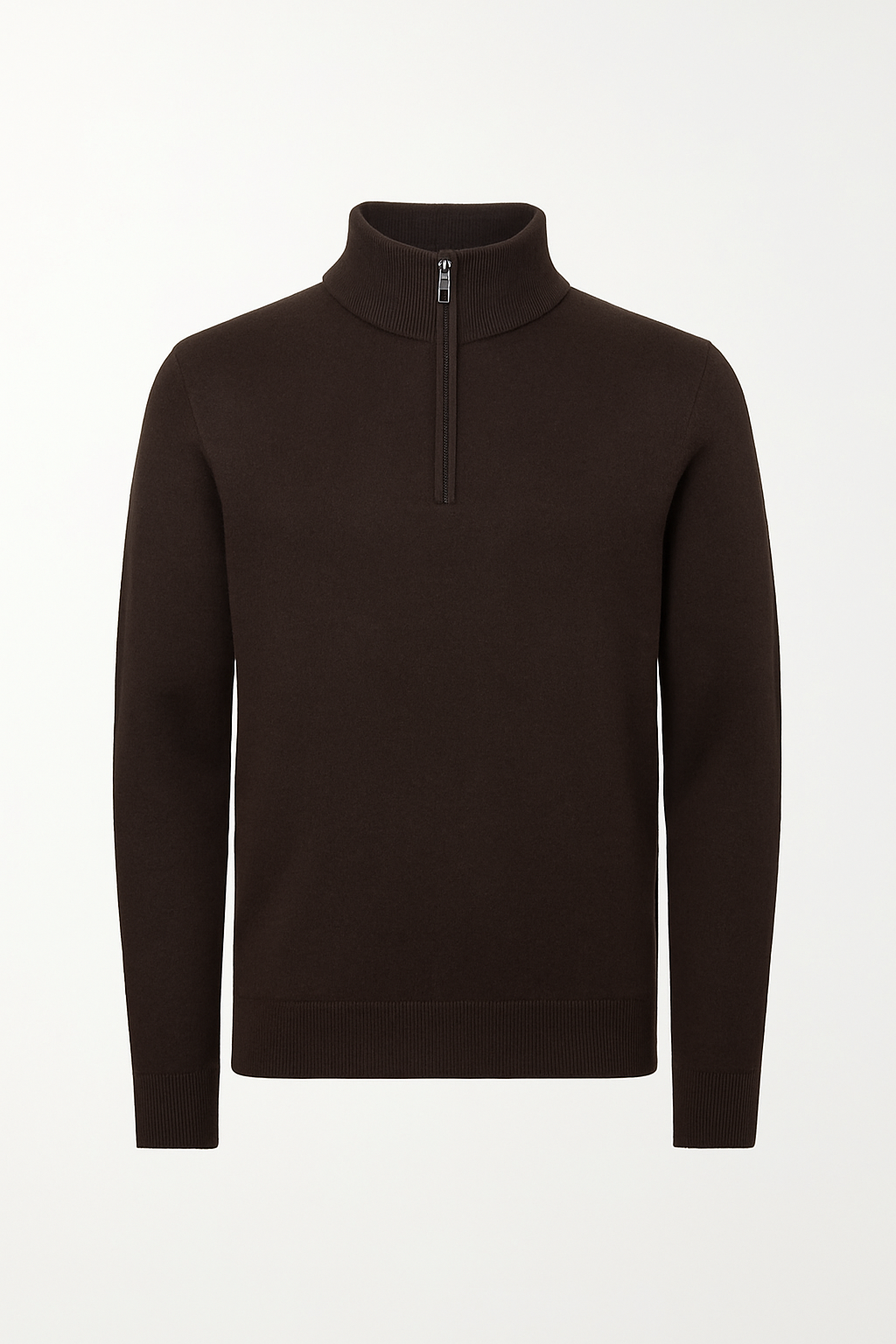 De moderne half zip-sluiting met metalen rits en de subtiele ribstructuur maken de trui veelzijdig — draag hem stijlvol over een overhemd of casual op de huid.