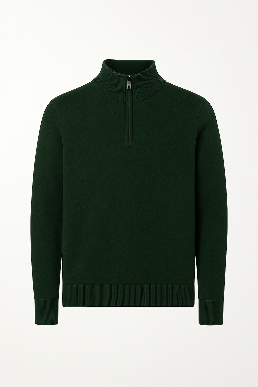 De moderne half zip-sluiting met metalen rits en de subtiele ribstructuur maken de trui veelzijdig — draag hem stijlvol over een overhemd of casual op de huid.